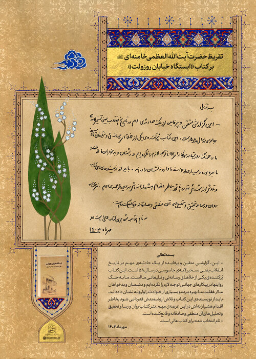 به گزارش خبرنگار کتاب ایرنا، حضرت تغریز آیت الله خامنه ای در کتاب «ایستگاه خیابان روزولت» در روز چهارشنبه ۱۸ آبان ۱۴۰۳ منتشر شده است. این کتاب روایتی مستند از تسخیر سفارت آمریکا در تهران است. محمد محبوبی در ۶۰۸ صفحه نوشته شده است.
