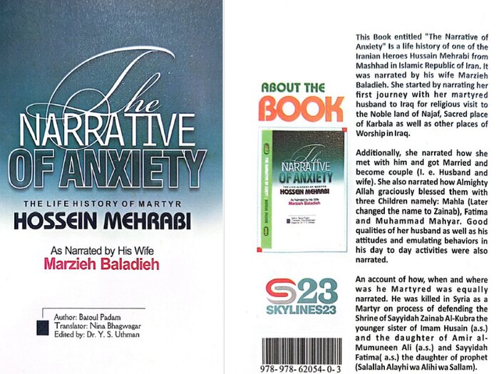 به گزارش ایرنا از روابط عمومی سازمان فرهنگ و ارتباطات اسلامی، کتاب «روایت بی قراری که تاریخ زندگی است». حسین محرابی شهید مدافع حرم به روایت مرضیه مریضه همسر شهید یکی از کتاب های مجموعه تاریخ شفاهی زنان قهرمان است که در انتشارات ستاره و هم اکنون رایزنی فرهنگی جمهوری اسلامی ایران در نیجریه به منظور معرفی آموزه های اصیل دینی به چاپ رسیده است. رفتارها به ویژه در میان جامعه مسلمان در عرصه بین المللی و توسعه. فرهنگ و ادبیات مقاومت این کتاب را به زبان انگلیسی در این کشور منتشر کرده است.