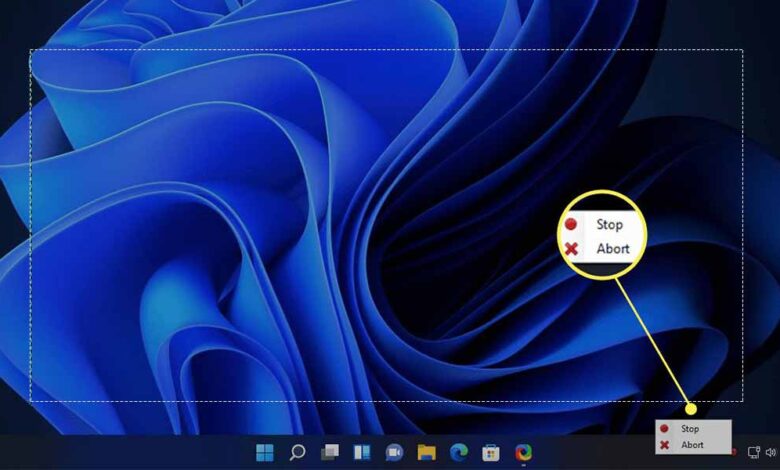 - در حین فیلمبرداری از ویندوز ۱۱یک کادر سفید برای شما نمایش داده می شود و می توانید با انتخاب دکمه توقف روی این کادر، ضبط ویدیو را متوقف کنید. این دکمه با کلید ترکیبی صفحه نمایش shift+prt نیز فعال می شود.