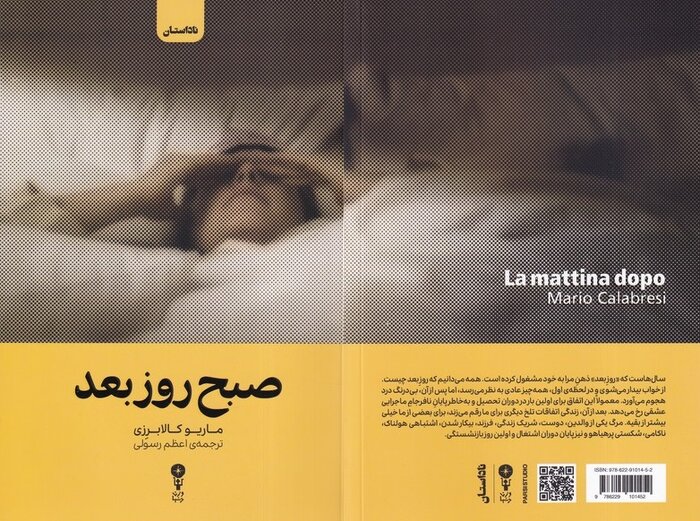 مترجم کتاب “صبح روز بعد” طراحی جلد کتاب را که به ایتالیایی منتشر شده است توضیح داد ، توضیح داد: روی جلد کتاب ایتالیایی “صبح روز بعد” عکسی از دو نفر است که در دریا ایستاده اند و موجی از آن آنها ماریو کالابرزی (نویسنده کتاب) می گوید وقتی موج به شما می آید ، نباید سرنگون شود ، باید با یک سر به موج بروید تا آسیب کمتری وارد شود. امواج وجود دارد و دریا به موج بعدی آرام می شود ، اما باید ببینید که چگونه با آنها روبرو می شوید. مهم است که با شما سازگار شوید تا آسیب های کمتری داشته باشید.
