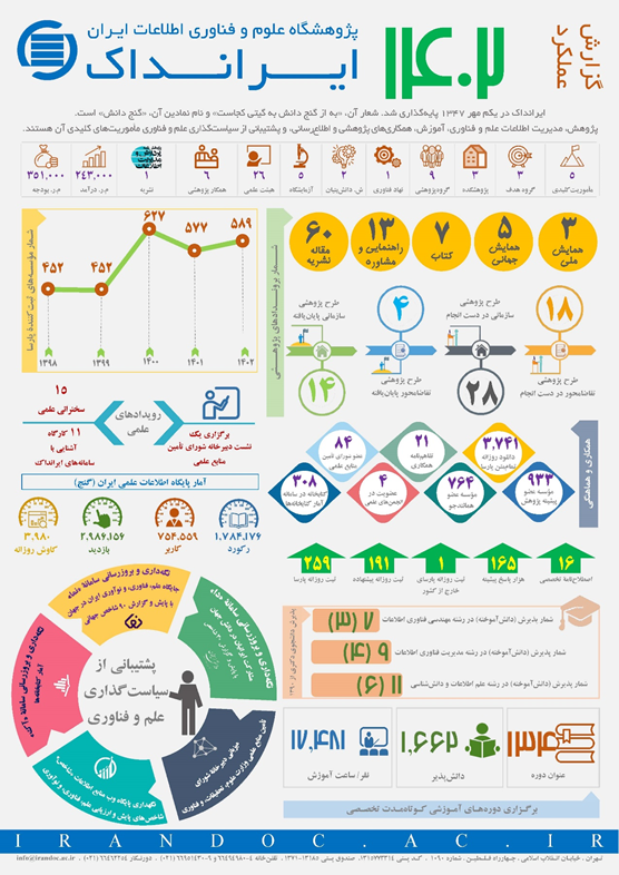 گزارش عملکرد سال ۱۴۰۲ پژوهشگاه علوم و فناوری اطلاعات ایران به پنج ماموریت بنیادین ایرانداک؛ پژوهش، مدیریت اطلاعات علم و فناوری، آموزش، همکاری و هماهنگی، و پشتیبانی از سیاستگذاری علم و فناوری پرداخته که متن کامل و دادهنمای این گزارش در نشانی irandoc.ac.ir/about/report در دسترس همگان است.